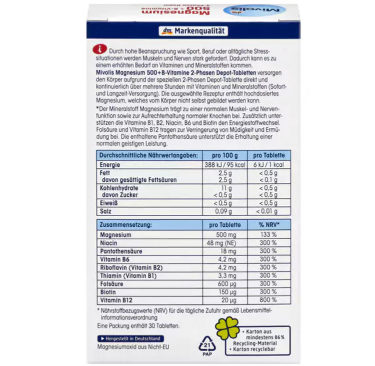 اگر ورزشکار هستید و یا در طول روز تحرک بالایی دارید از محصولات برند میولیس (Mivolis) می توانید نمونه های بسیاری از انواع مکمل و ویتامین را مشاهده نمایید که ساخته شده در کشور آلمان است و بسیار موثر و مفید می باشد.یکی از محصولات پرطرفدار و ارائه شده در فروشگاه تیک تاپ ارسال مستقیم از المان،اکنون نمونه جدید همراه با ویتامین بی ارائه شده است که طرفداران مخصوص خود را دارد.اصولا مکمل منیزیم بسیار مورد توجه ورزشکاران قرار دارد و از اسپاسم عضلانی و خستگی جلوگیری می نماید و از این رو می توان نمونه های بسیاری از قرص و ساشه را تهیه نمود و استفاده کرد.البته باید توجه نمود که در تغذیه روزانه و وعده های غذایی حتما تنوع خوب و بالایی از ویتامین استفاده کنیم و برای کسانی که در تغذیه روزانه نمی توانند به مقدار کافی از ویتامین B و منیزیم دریافت نمایند از این محصول بهره ببرند.