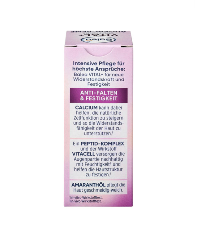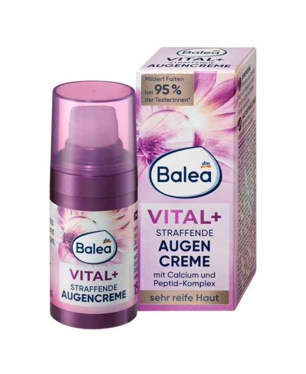 کرم دورچشم ویتال پلاس باله آ به مقاومت و استحکام پوست کمک میکند و ناحیه دور چشم شما را تغذیه و تقویت کرده و باعث خاصیت ارتجاعی پوست می شود.کلسیم موجود در این محصول موجب می شود عملکرد سلول های طبیعی پوست افزایش یافته و مقاومت بیشتری به پوست دهند.